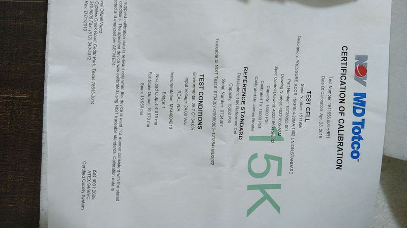 Nov MD Totco Pressure Transducer For Cement Uni 4-20mA 15000psi P/N-10728055-001