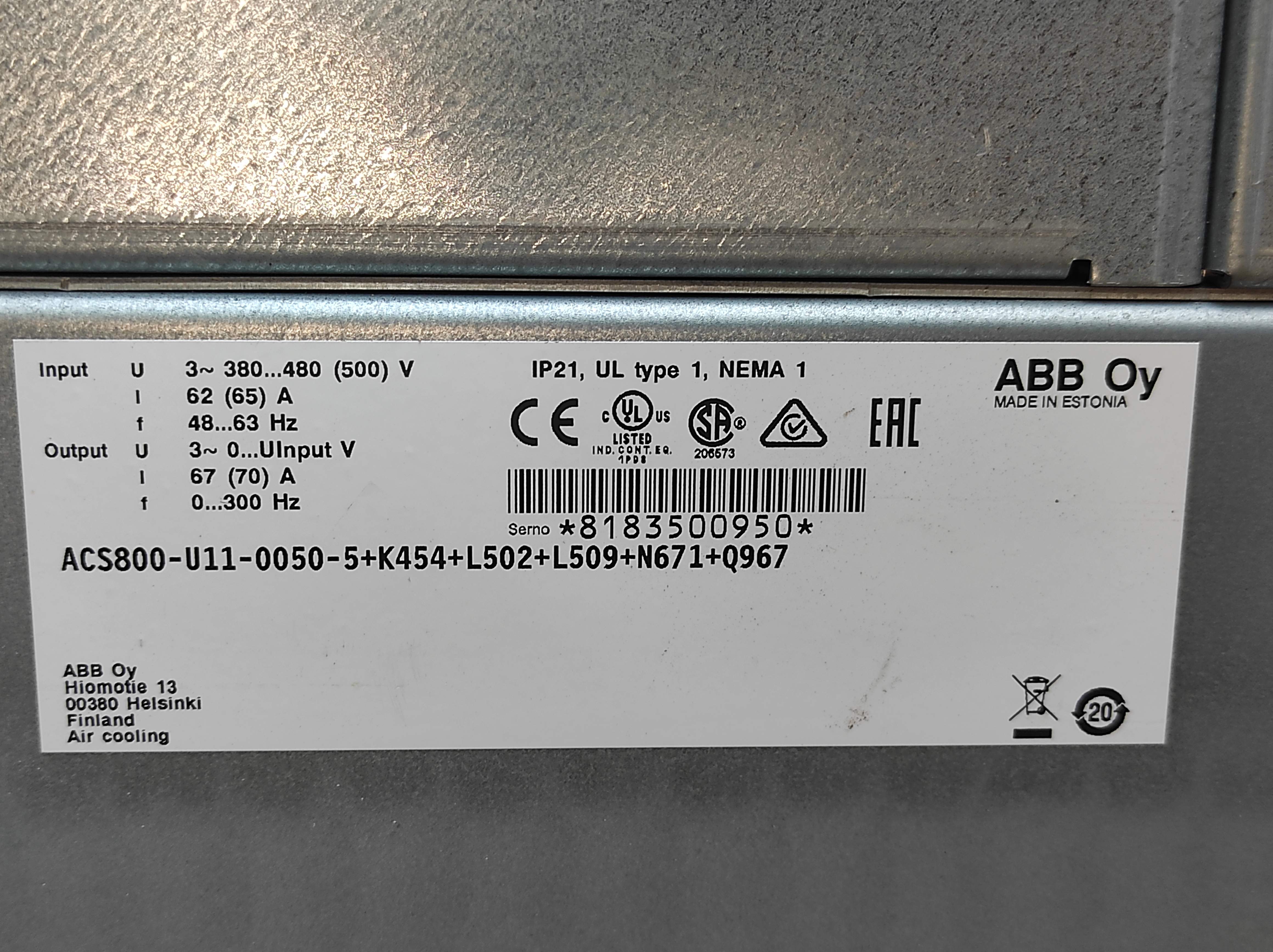 ABB ACS800-U11-0050-5+K454+L502+L509+N671+Q967 Drive